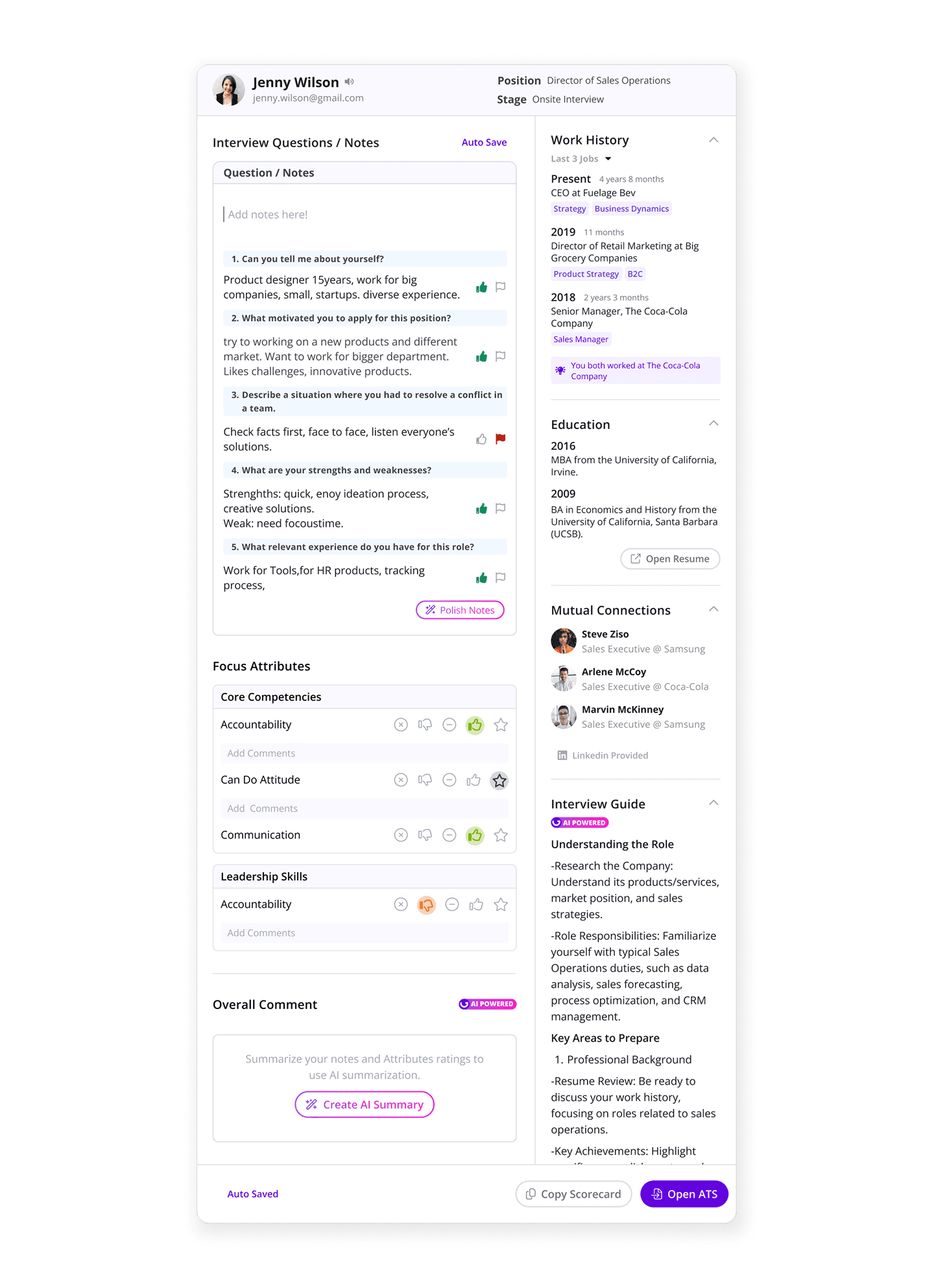AI Scorecard automates the shift from live interviews to formal ATS evaluations. It syncs with Greenhouse and Workday, allowing interviewers to focus on candidates while the system handles structured data organization.